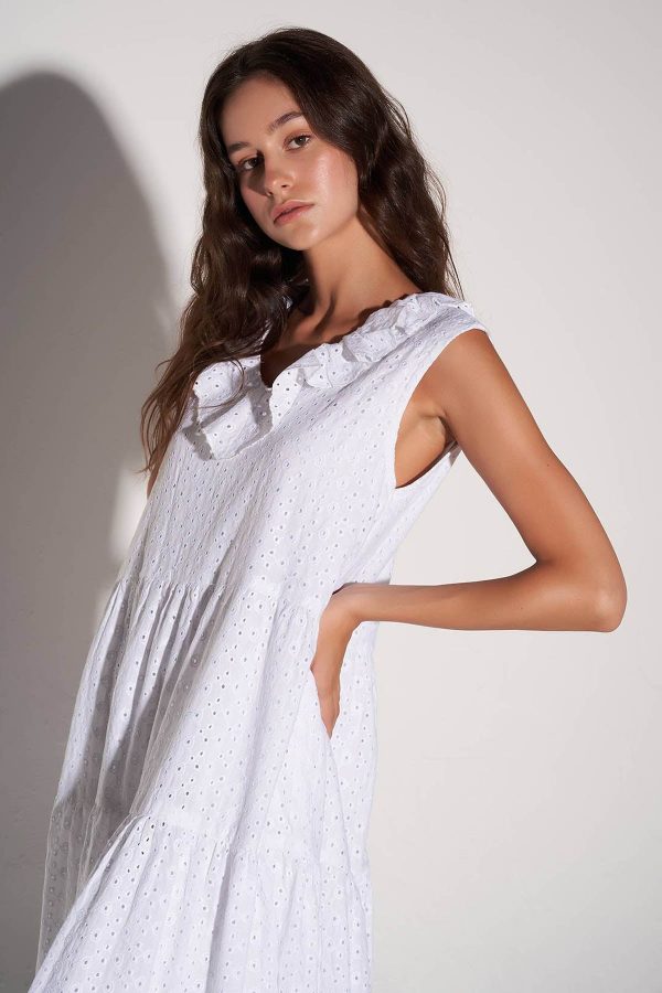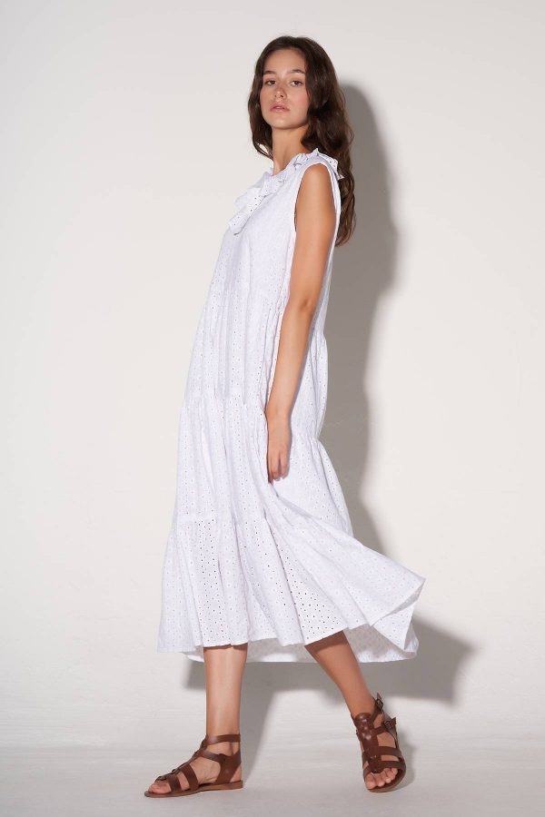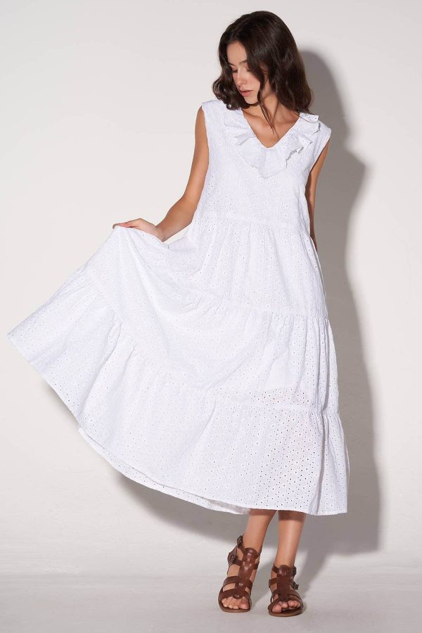 100% Cotton. Sleeveless Shifley Tiered Long Dress With V Neck Featuring Ruffles. Nape Line Ruffles. Wide Hem