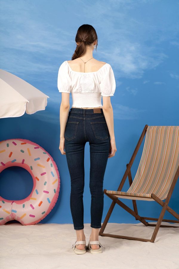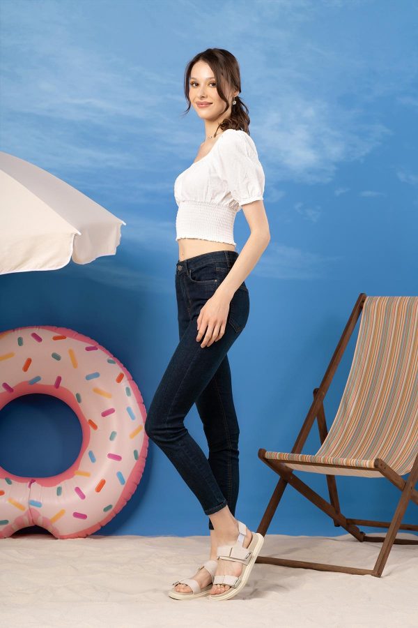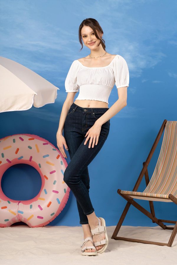 100% Cotton. Casual Gathered Florentine Neckline Top With Puff Sleeves Featuring Shirring Waist.
